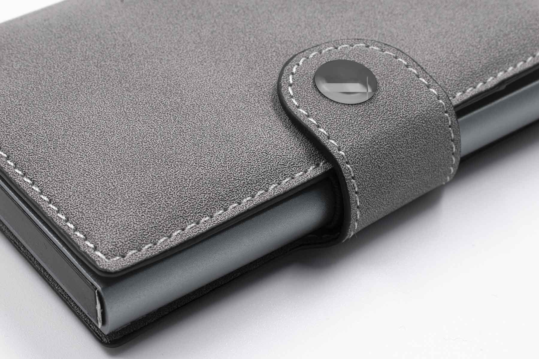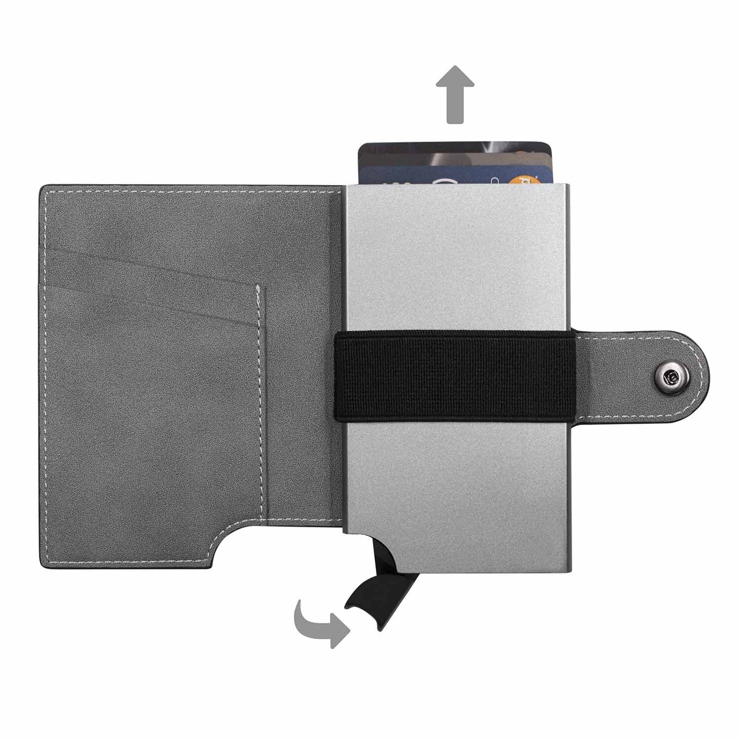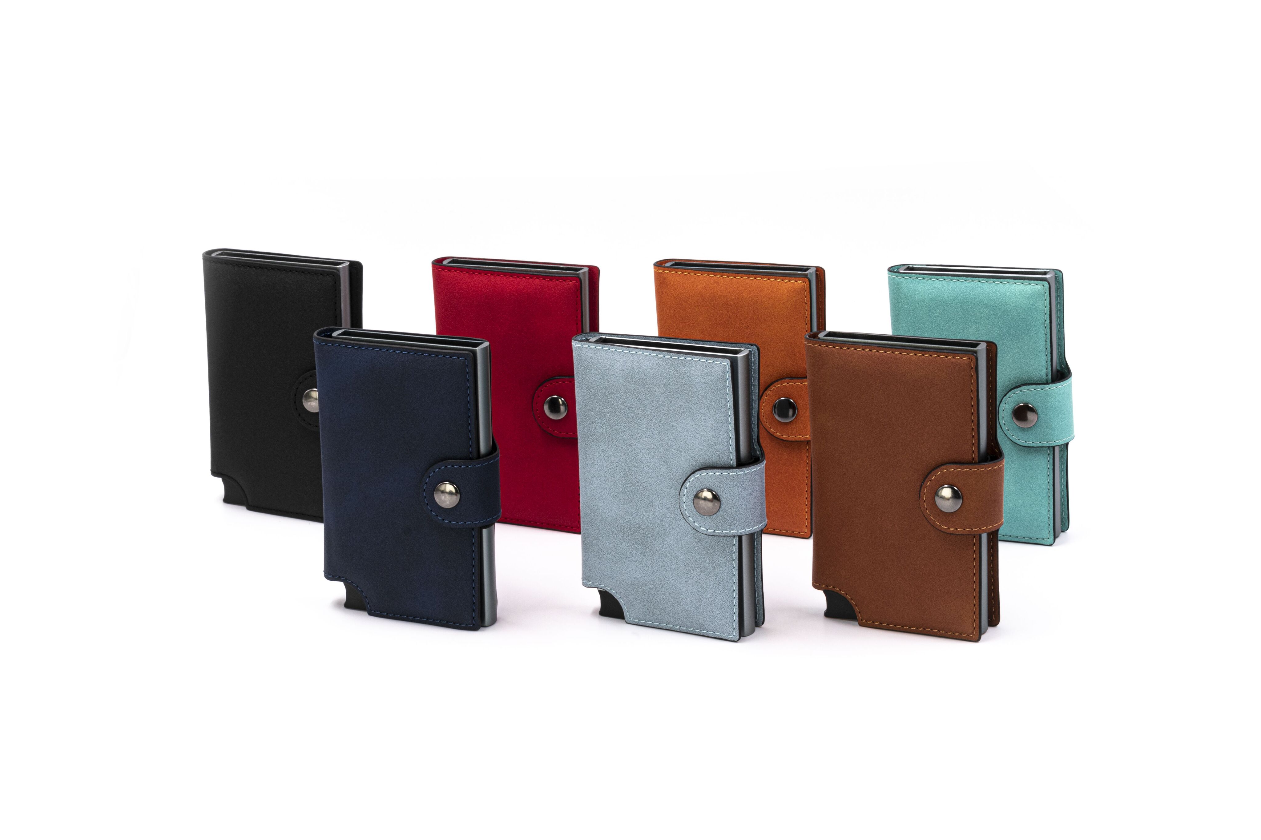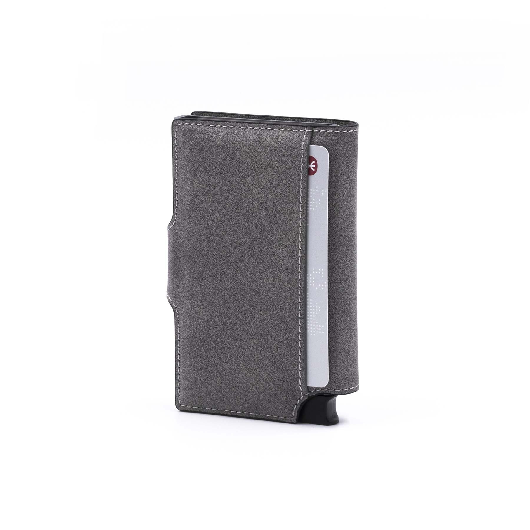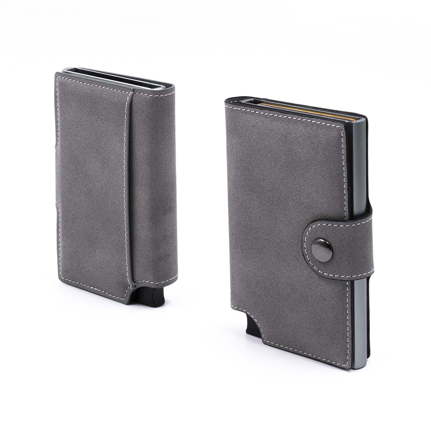 Компактный картхолдер изготовлен из веганской замши и алюминия с функцией RFID-защиты и механизмом для быстрого доступа к картам. Вмещает до 9 карт стандартного формата, оснащен эластичной лентой для наличных.