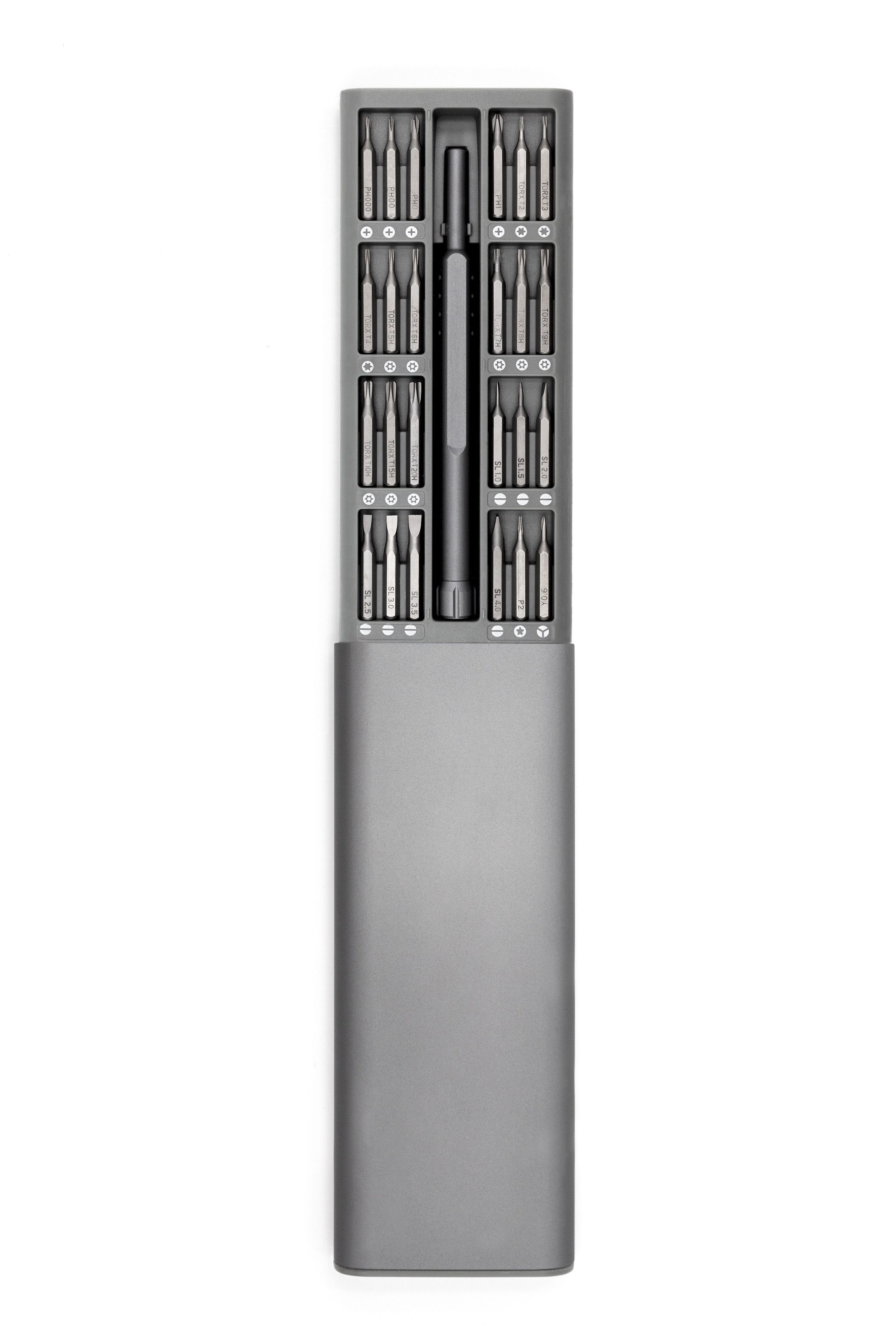 Набор высокоточных отверток для ремонта смартфонов, планшетов, ноутбуков (включая iPhone, iPad, MacBook Air и MacBook Pro), а также игровых консолей Nintendo, PlayStation и Xbox. Включает в себя 24 магнитные прецизионные биты из прочной стали S2 (твердость HRC 58–62). Эргономичная алюминиевая ручка с анодированным покрытием и противоскользящей вращающейся крышкой. Удобный алюминиевый кейсс с пружинным механизмом и магнитным основанием.