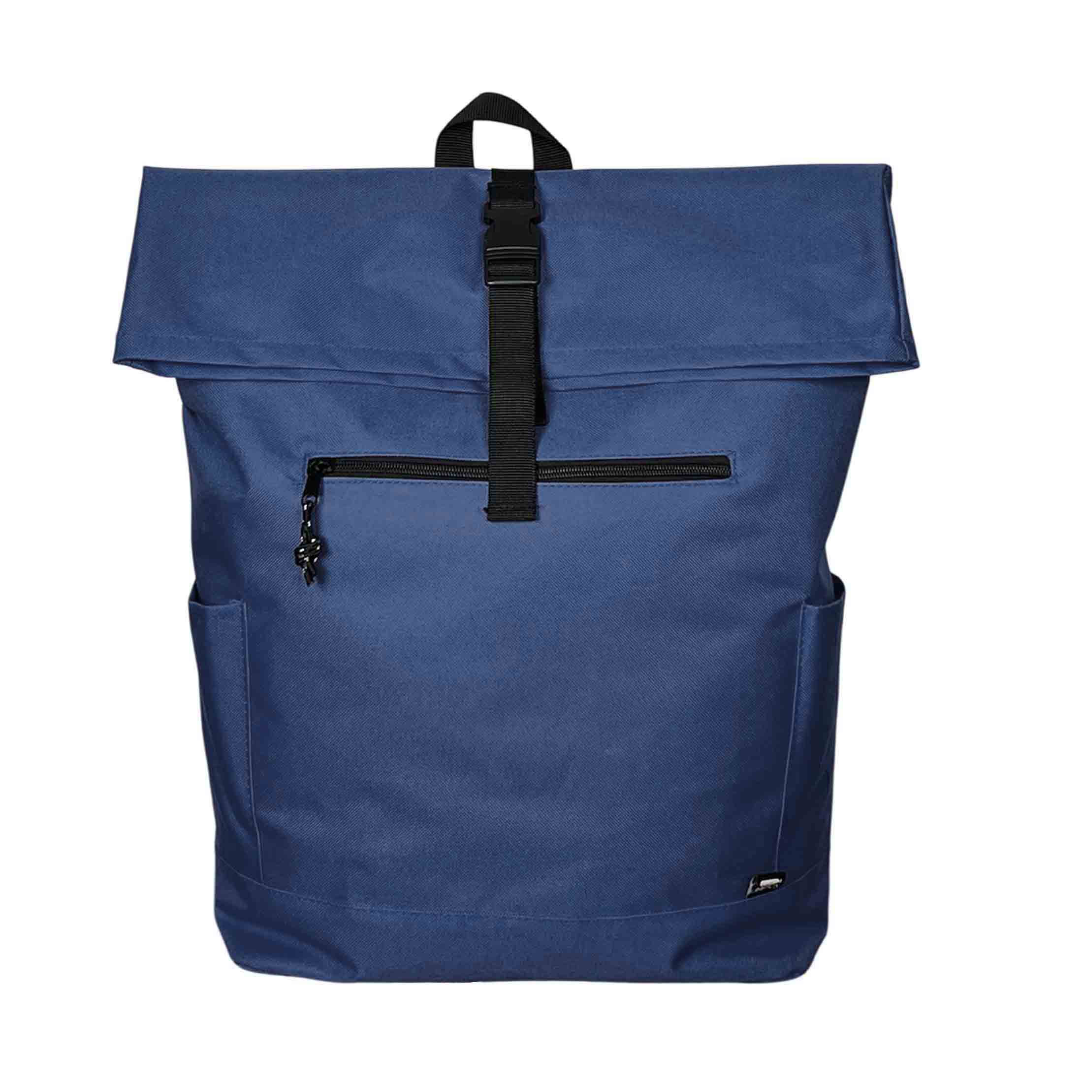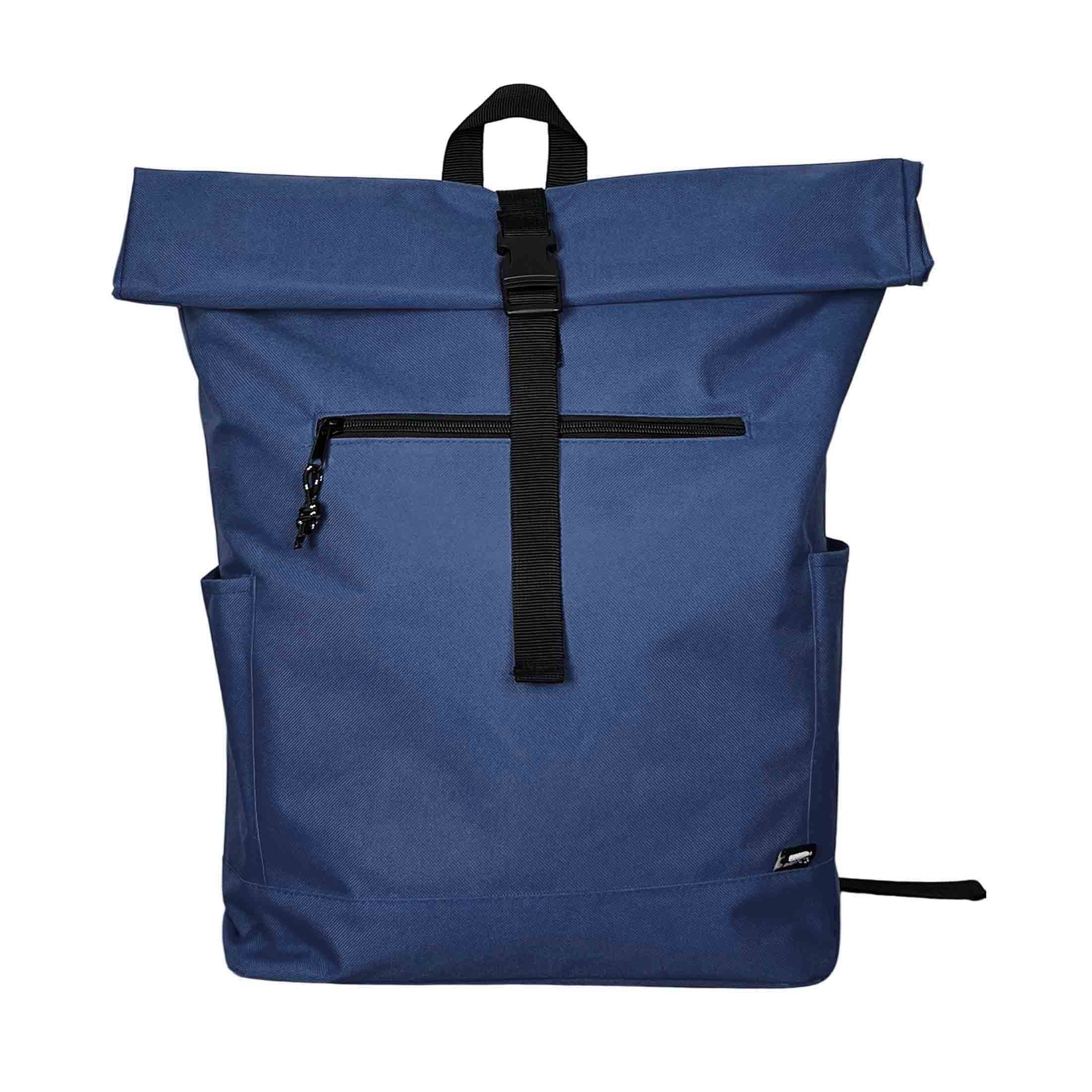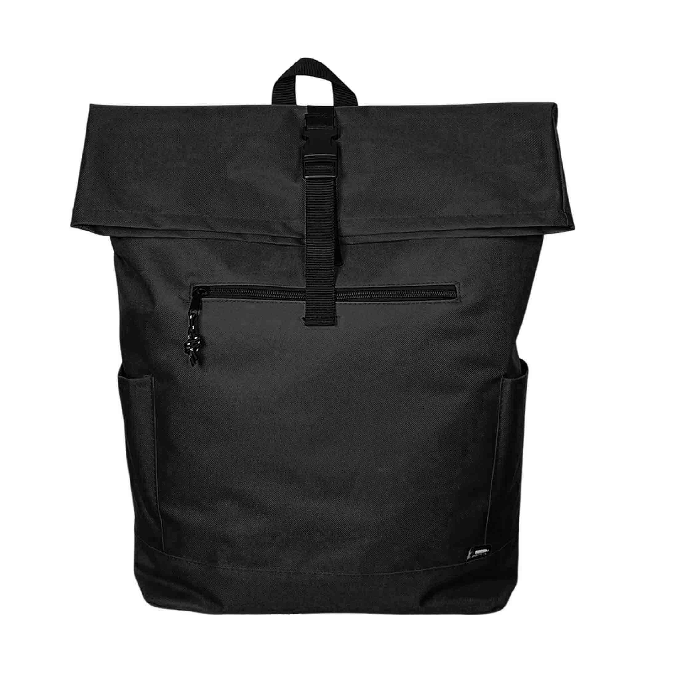 Рюкзак из переработанного пластика (RPET). Система roll-top скручивания верхней части позволяет регулировать объём и обеспечивает дополнительную защиту содержимого от влаги и пыли. Имеет фиксацию основного отделения на застёжке, вместительное внутреннее пространство с мягким карманом для ноутбука или планшета, передний карман на молнии, боковые карманы для бутылки и мелочей. Выполнен из прочного износостойкого полиэстера 600D. Размер 32 x 13 x 45-60 cм